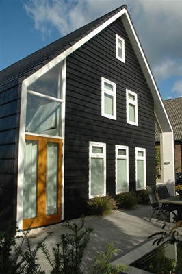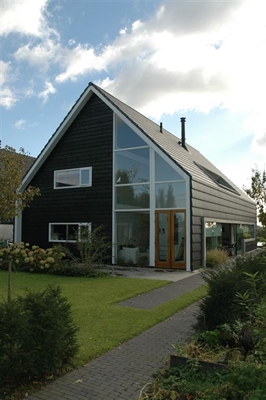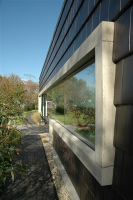 Bongers Architecten uit Oud-Alblas staat bekend om haar ontwerpen met strakke lijnen. Voor het woonhuis van directeur Cees Bongers werd een fraaie toepassing bedacht van een vlakke dakpan in zowel het dak als de gevel.