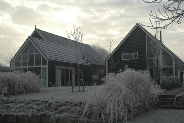 Het ontwerp van het woonhuis is fraai afgestemd op de omgeving, met name de waterpartijen. Het dak is uitgevoerd met verholen goten in kaders van polyesterbeton, er zijn op het dak dus geen goten zichtbaar. Er zijn ook geen zichtbare hemelwaterafvoeren aangebracht: het hemelwater loopt direct van het dak in een grindkoffer met drainage.