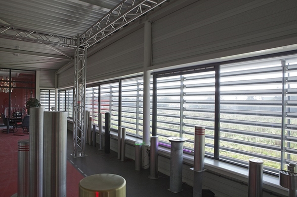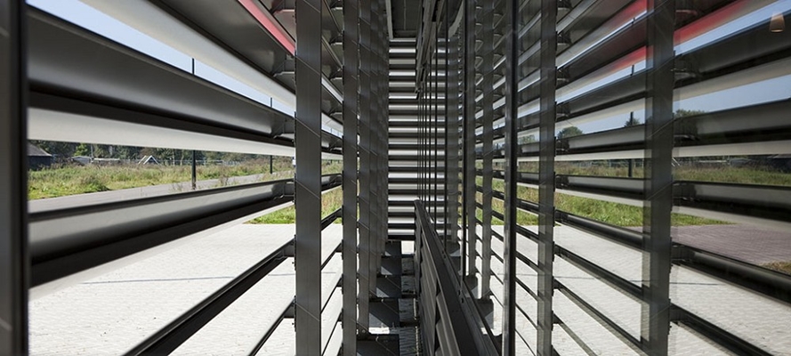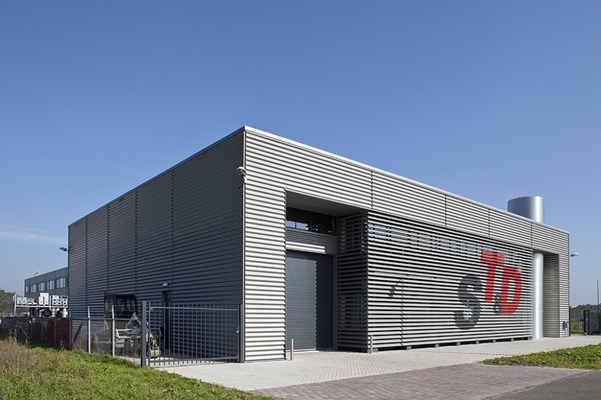 Een productiehal met 2 lagen kantoor ervoor op industieterrein Apeldoorn-Noord. Voor de meest geavanceerde producent van “pollers” voor de afsluiting van voetgangersgebieden in stadscentra. De LEDs in de bovenrand van de roestvrijstalen trappenhuiskoker lichten ’s avonds rood op, identiek aan die in de bovenrand van hun pollers. Vanwege de zuidligging van de voorgevel zijn zonweringslamellen aangebracht, waarop het logo geplaatst is. Rechts van de kantoren de entree tot het kantoor en links ervan de paneeldeur waar de wagens met materialen het pand verlaten.