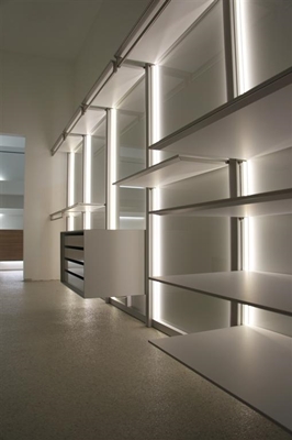 werden de profielen voorzien van geïntegreerde functionele led verlichting over de ganse verticale profiellengte. Tevens werd een spierwitte gelakte glasplaat als rug op de muur gekleefd tussen de profielen in zodat de wand volledig afgewerkt is. (U kan natuurlijk ook de muren zichtbaar laten.)