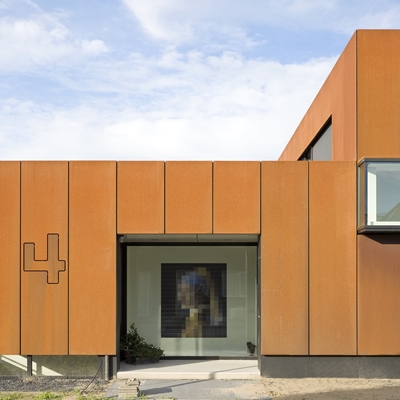 Het ontwerp oogt robuust en is op detailniveau zeer verfijnd. Het constructieve staalskelet waar het woonhuis grotendeels uit is opgebouwd blijft in het interieur volledig in het zicht. Dit industriële karakter van de woning wordt in de materialisering van de gevels verder doorgevoerd. "Corten" stalen gevelplaten geven de woning in tijd een veranderlijk voorkomen; van diep donker staal kleurt de gevel naar helder oranje en eindigt donkerbruin-oranje.