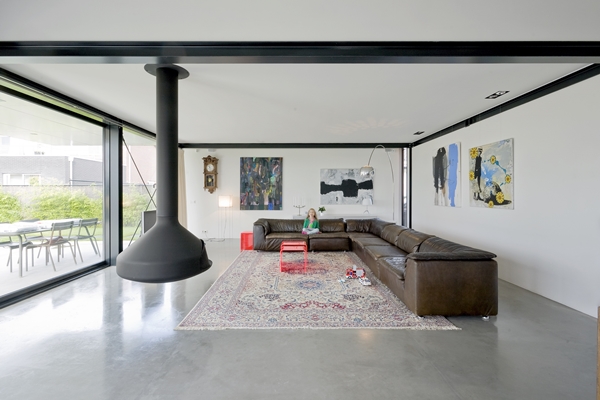 De woning heeft een introvert karakter en geeft de bewoners de gewenst privacy. De grote woonkamer heeft over de volle breedte te openen schuifpuien voor een optimale relatie met de tuin. Een vrij overhangend overstek geeft het terras op spectaculaire manier beschutting tegen regen en zon. De slaapkamers en de badkamers zijn met hun grote ramen georiënteerd op een groendak; een verborgen tweede tuin.