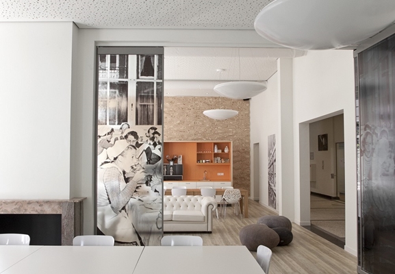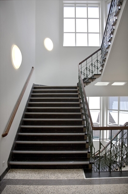 Op de 1e en 2e verdieping is het ‘back-office’ ingericht met kantoorruimten, vergaderruimten en een werkcafé. Op de glazen scheidingswanden van het werkcafé is folie aangebracht met foto’s van de oorspronkelijke school. Er is naar gestreefd zoveel mogelijk karakteristieke elementen van het gebouw te behouden.