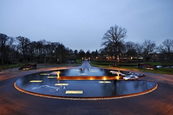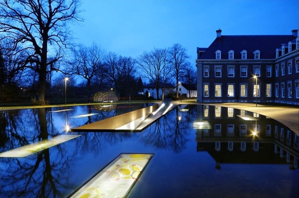 De kwaliteit van deze representatieve kant van het landgoed is behouden en versterkt door een grote nieuwe vijver aan te leggen waar de entree naar de parkeergarage ‘onzichtbaar’ doorheen snijdt. De vijver, met een wateroppervlak van 730 m² en 60 cm diepte, heeft een rand van CorTenstaal. In de vijver zijn lichtschachten opgenomen die voor daglicht in de parkeergarage zorgen. De openingen zijn afgedekt met gekleurde glaspanelen die elk afzonderlijk zijn vormgegeven als kunstwerk. Wanneer ‘s nachts het licht vanuit de parkeergarage door deze panelen naar boven schijnt, ontstaat een bijzonder effect . Bovendien wordt het watervlak zo nu en dan verlevendigd door speciale fonteinen die kleine bubbels net boven de waterspiegel produceren.