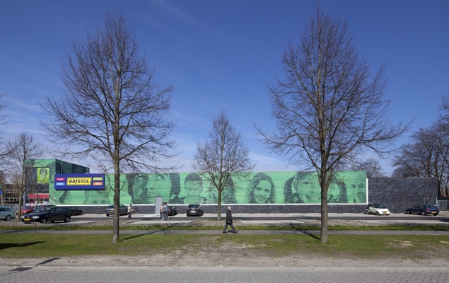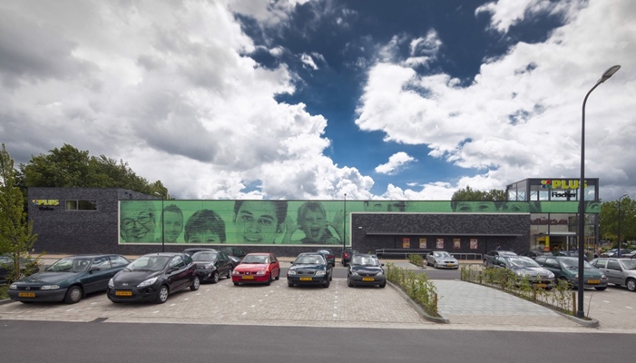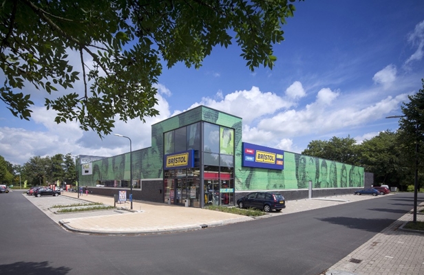 De twee verschillende gebruikers wilden beide een goed herkenbare entree voor de herkenbaarheid en een gesloten gevel vanwege de stellingen. Op de twee belangrijkste hoekpunten zijn de entrees overhoeks gepositioneerd om een maximale exposure te krijgen. Dit wordt versterkt door het hoogteaccent dat verschillend vormgegeven is om onderscheid te maken tussen de winkels. De gesloten gevelvlakken met een hoogte van 8 meter vragen om een passende vormgeving. Gekozen is voor een kunststof gevel omdat deze door het lage gewicht gemonteerd kan worden op de bestaande binnendoosconstructie zodat er zoveel mogelijk van het bestaande gebouw hergebruikt kan worden. Door in de kunststof platen een gezichtenprint op te nemen krijgt het gebouw een vriendelijke uitstraling die het winkelend publiek welkom heet.