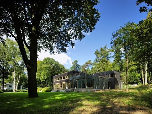 De villa ligt zorgvuldig ingepast op geaccidenteerd terrein in de bossen. Twee volumes, één van antraciet baksteen en één van geprint glas, vormen samen een haak en voegen zich gezamenlijk naar de haaks gevormde bosrand. In deze beschermende omarming ligt de goudkleurige woon- en slaapcocon, waar een schoepengevel voor extra beschutting zorgt. Het antraciete bakstenen volume biedt ruimte aan de ruime garage, study, fitnessruimte, sauna en gastenverblijf, in het glazen volume bevindt zich het langwerpige zwembad. De interieurarchitect ontwierp in nauwe samenspraak met opdrachtgever en de architect het gehele interieur van de woning. De villa is van de nodige domotica voorzien en is bijzonder energiezuinig, onder andere door het toepassen van een warmtepomp, sedumdaken en zonnepanelen. De omliggende tuin vormt de verbinding tussen de grillig natuurlijke omgeving en de strakke lijnen van de architectuur.