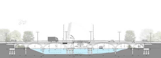 Over Vecht en oevers Ons ontwerp voor de Nieuwe Muiderbrug is tijdloos van uiterlijk, maar "state of the art" qua constructie. Er is veel aandacht besteed aan de beperking van materiaal- en energiegebruik en tegelijkertijd aan een optimale gebruikskwaliteit. Zo hebben wij gekozen voor een betrouwbare electromechanische bewegingstechniek van het val, met energiebesparend contragewicht. De hoofdconstructie is uitgevoerd als in situ beton kruisgewelf. Maximale transparantie voor alle gebruikers onder de brug door gaat gepaard aan minimaal materiaalgebruik. Overbodige bouwmassa is als het ware "weggesneden". De tussenpijlers liggen zoveel mogelijk boven water, zodat de doorstroming van de Vecht niet wordt gehinderd. Dankzij de rigide constructie van de kruisgewelven (de constructeur noemt het "een integraalbrug") kan de brug zonder overgangsvoegen worden uitgevoerd, hetgeen resulteert in een belangrijke vermindering van de geluidoverlast.