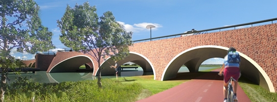 Inspiratie Voor ons is de opgave bij het ontwerp van de Nieuwe Muiderbrug tweeledig. Enerzijds moet de brug maximaal zicht van Muiden tot diep in het landschap en omgekeerd faciliteren, alsmede passage voor schepen, fietsers en auto's. Maar tegelijkertijd moet hij ook naadloos passen in het omringende landschap van Vecht, polder en historische stad. In onze optiek is het archetype van de stenen boogbrug hiervoor een geschikt model. Dit is een klassiek brugmodel dat in heel Europa al eeuwen wordt gebruikt en in Neder- land onder andere bekend is van de grachtenbruggen in Amsterdam. Wij stellen ons een contemporaine en tegelijkertijd klassieke brug voor die het water met elegante, strikt functionele bogen overspant, zowel dwars op de Vecht als in het verlengde. Hier- door wordt het uitzicht op en vanuit de omgeving gemaximeerd. In materialisering en vorm sluit de Nieuwe Muiderbrug op een eigentijdse wijze aan op de indrukwekkende civiele en militaire baksteenwerken van Muiden zoals de "Groote Sluis", de verdedigingswerken van de stelling van Amsterdam en het Muiderslot.