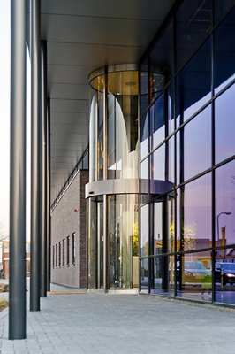 met hoge kapconstructie van Boon Edam. Deze draaideur past prachtig in de strakke gevel en straalt moderne techniek uit, precies zoals de opdrachtgever het zich had gewenst.