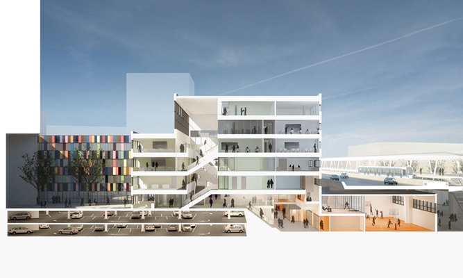 De locatie is complex en veeleisend, naast (en deels onder) het verhoogde station van de Noord-Zuid metrolijn en de Nieuwe Leeuwarderweg , in het ‘nieuwe’ centrum van Amsterdam Noord (CAN gebied). Het nieuwbouw is de nieuwe behuizing voor twee hoofdgebruikers, het ROC van Amsterdam (MBO) en het Bredero College (MAVO) waarin een nieuw type schoolgebouw wordt gecreëerd: het Community College. Het schoolgebouw staat daarbij midden in de maatschappij en de maatschappij staat centraal in het gebouw. Het gebouw is georganiseerd in de vorm van een “dubbele helix”. Dat betekent dat de ene school door de andere heen naar boven draait via inspirerende ‘escher-achtig’ routes waarbij de leerlingen van de verschillende scholen elkaar wel kunnen zien maar niet kunnen aanraken. Binnen het gebouw zijn expressie en sfeer gedacht als één “total educational experience” voor beide hoofdgebruikers. Het interieur wordt zo licht mogelijk gehouden. Zes grote dubbelhoge of driedubbelhoge raamopeningen zijn door het gebouw verspreid waar het ROCvA aan de buitenwereld kan laten zien wat er binnen in het gebouw gebeurt, een soort vensters naar de toekomst. De kleurijke en geparcelleerd gevelbeeld die gerelateerd is door de functioneel verdeling is bedoeld als een vertaling van het ROCvA onderwijs visie, ‘klein binnen groot’ vorm te geven en wordt een ruimtelijke strategie om het school programma in het toekomst te kunnen krimpen of uitbrieden.