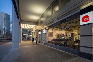Aan de straatzijde zijn, gericht op het Weena, grote nieuwe luifels geplaatst met geïntegreerde verlichting, die de nadruk leggen op de entree’s van het winkelgebied en de kantoren. De entree van het winkelplaza is verplaatst naar de hoek, gericht op het nieuwe Stationsplein. Een grote tourniquette is als een sculpturaal cilinder element in de arcade geschoven. GROUP A heeft ook voor de arcade een plan ontworpen, waarin deze is voorzien van nieuwe bestrating, plafonds en verlichting. De aanhaking van het winkelgebied op het omliggend openbaar gebied word hiermee sterk verbeterd en zorgt voor een prettige sfeer, overdag en ’s avonds.