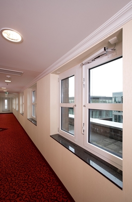 Veiligheidsaspecten en toegang voor iedereen moet vanzelfsprekend zijn in hotels, zelfs buiten de wettelijke vereisten. Brandbeveiliging in hotels bestaat uit het rookvrij houden van nooduitgangen, aangezien iedereen hier in geval van brand zo snel mogelijk door moet kunnen of in veiligheid gebracht moet worden. Deze taak wordt vervult door "natuurlijke rook- en warmteafvoerinstallaties" die de rook afvoeren uit het hotelgebouw na automatische activering, bijvoorbeeld door een rookmelder. Overeenkomstige controle-eenheden staan de gecoördineerde activering toe van alle deuren en ramen voorzien van openingssystemen, die dienen als ventilatieopening voor frisse lucht of als een opening voor de rookafvoer bij brand. Als bijkomend, energiebezuinigend effect, functioneren ze ook als controle en monitor voor dagelijkse ventilatie.