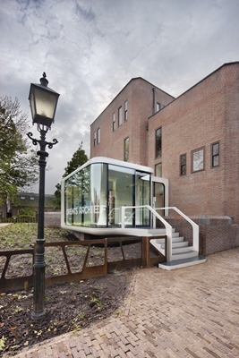 Het monumentale gebouw had vóór de verbouwing een zeer gesloten karakter en werd ontsloten via een klein torentje aan de Brink van Assen. Met een nieuw entreepaviljoen aan de andere zijde is het gebouw toegankelijk en uitnodigend geworden. Door de complete omkering van de routing en het bijbehorende programma is het oude gebouw letterlijk in deze tijd geplaatst. De parelwitte entree is al vanaf het station aan de singelzijde zichtbaar en is bereikbaar via de nieuwe archieftuin of het naastgelegen Museumlaantje. Een lang meanderend pad brengt je tot de adembenemende entree. Via deze futuristische ‘tijdmachine’ betreedt je het oude archiefgebouw en ontvouwt zich de geschiedenis.