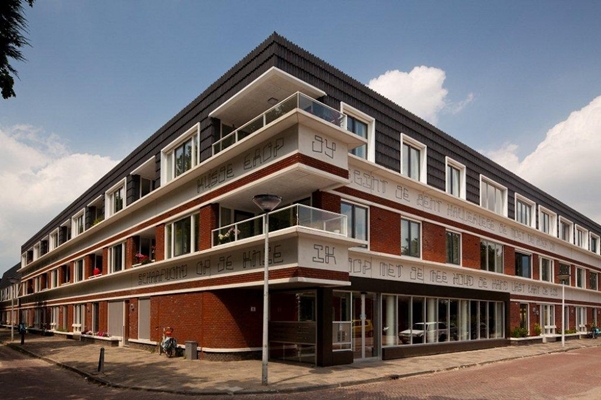 Op een aantal plekken is bij de voorgevel van de woning bankjes ontworpen om de levendigheid van de straat te vergroten. Voor de witte gootlijst heeft een hedendaagse dichter regels geschreven die de voorbijganger tot nadenken zet.