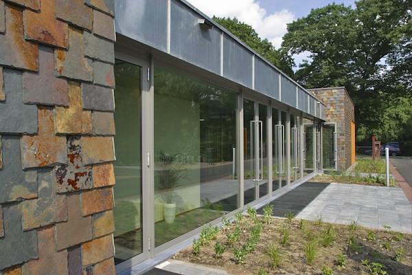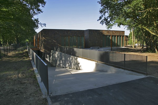 De ‘natuurlijke’ en ‘aardse’ uitstraling van de uit een mix van bruine, groene en oranje natuurleien opgetrokken gevels, onderstreept de ligging van het gebouw langs de bosrand. In 2009 ontving