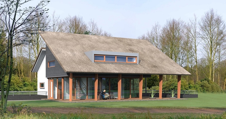 Een moderne rietgedekte villa in het buitengebied van Ommen. Met een royale veranda op het zuiden, direct grenzend aan de living, wordt optimaal ingespeeld op het vrije uitzicht op de landerijen. De materialisatie sluit aan op de omliggende woningen, waardoor de woning zich ondanks zijn eigentijdse vormgeving, prima voegt tussen de bestaande woningen.