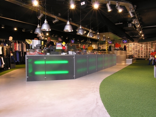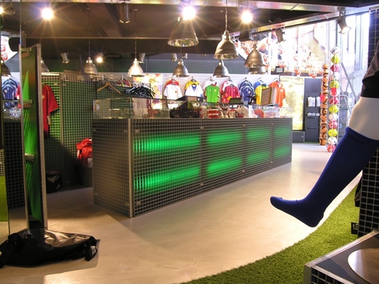 Geen saaie uitstraling van rekken in het nieuwe soccercenter, maar een ambiance die bepaald wordt door een trapveldje met boarding. ‘Als je nieuwe schoenen hebt gepast en even wil testen hoe ze zitten, dan kan dat op dit veld’, zegt Van den Belt vanaf de tribune.