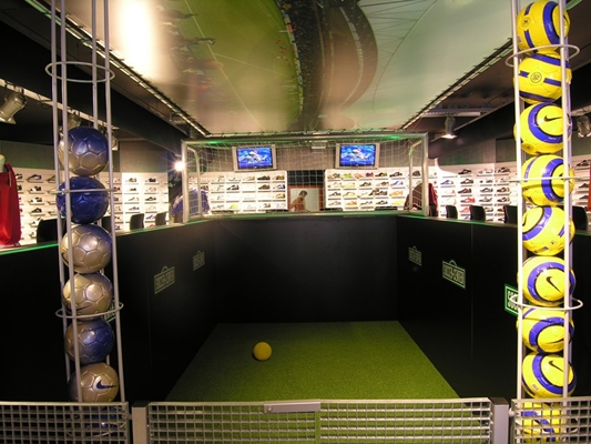 Metalen toegangspoort, miniatuurstadion in het hart van de zaak. Alles ademt voetbal, in het soccercentrum van Walter van den Belt. Voetbal is emotie weet Walter. Ook een sportzaak verdient beleving.