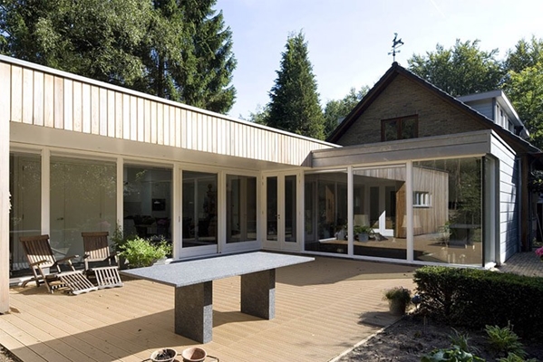 De gevel wordt afgewerkt met western red cedar houten delen die, in verband met de boom- en bosrijke omgeving, verticaal worden geplaatst. Hierdoor wordt het gebouw opgenomen in zijn omgeving. De gevel rondom het terras is geheel van glas, waardoor verschil tussen binnen en buiten op die plek helemaal vervaagd.