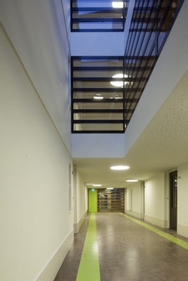 De organisatie van het gebouw is lineair, er is een brede middencorridor waar ruimte is voor sociaal leven en waar scootmobielen geparkeerd kunnen worden. De middencorridor is voorzien van twee lichthoven die een duidelijke bijdrage leveren aan de verblijfskwaliteit. Per verdieping is een accentkleur gekozen om de herkenbaarheid en oriëntatie in het gebouw te vergroten. Aangezien de doelgroep veelal de lift zal gebruiken is er geen centrale hoofdtrap maar twee glazen trappenhuizen op de uiteinden van de corridor. De keukens van de woning hebben met een raam contact met deze binnenstraat en vice versa.