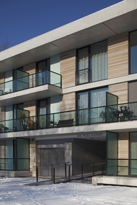 De paviljoen-gedachte is als volgt uitgewerkt: duidelijke vloerranden worden ingevuld met penanten van donker metselwerk (buitenschil) of hout (binnenschil). De kleuren van het gebouw zijn rustig gehouden. Het volume presenteert zich als eenheid maar mede door de verspringende balkons is elke woninggevel verschillend. Dit zorgt voor afwisseling terwijl het gebouw toch als een autonome eenheid in het park staat. Door toepassing van een plint op 50 cm boven maaiveld en maaiveldbalkons in plaats van tuintjes wordt verrommeling rond het gebouw voorkomen en bovendien wordt het uitzicht en gevoel van veiligheid voor bewoners van de begane grond vergroot.