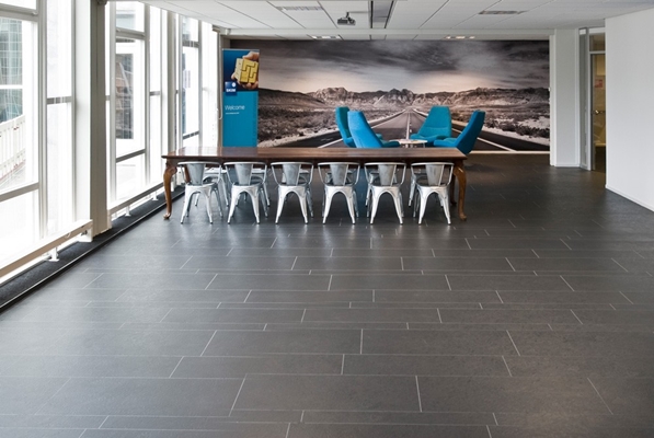 Door te werken met meerdere formaten vloertegels in willekeurig patroon gelegd, wordt het informele karakter van de ruimte versterkt. Om daarbij vanuit materiaal- en kostenefficiëntie ook te werken vanuit de standaard maatvoering van de norament serra tegels is ervoor gekozen om dan de helft van de tegels te versnijden naar ‘nieuwe formaten’. De drie verschillende formaten in ogenschijnlijk willekeurig patroon gelegd, zorgen tezamen precies voor het ge-wenst effect. Twee formaten zouden te weinig zijn en vier of meer formaten voegen niet heel veel extra’s toe.