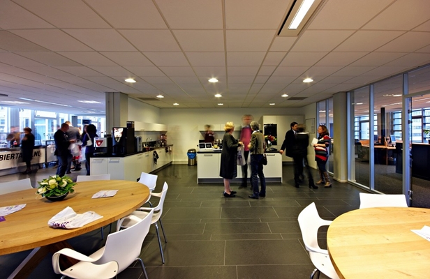 Het gehele interieur voor het kantoor van SKIM in het Groothandelsgebouw was toe aan een stevige opfrisbeurt. Enerzijds vanwege het verouderde interieur, anderzijds vanwege het ‘nieuwe werken’ zoals SKIM dat voor ogen heeft. SKIM heeft haar nieuwe kantoorinterieur benoemd als Workspace 2.0 en de kantine vormt daar een wezenlijk en centraal onderdeel in.