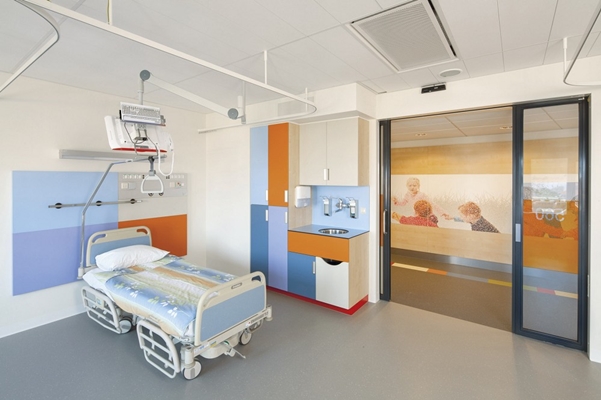 Bij de sanering van het Moeder-Kindcentrum speelden kleuren een centrale rol. Het algemene kleurenconcept, ontworpen door Architectenbureau Koldeweij en S&D Ontwerpers, omvat naast de inrichtingselementen ook de muren en de vloeren. In de gangen en de patiëntkamers zorgen de noraplan signa vloerbedekkingen in verschillende warme kleuren voor een behaaglijke sfeer. De bonte kleurstrepen van noraplan uni geven een vrolijk accent aan de gangen van de afdelingen. De kleuren van het inlegwerk van de vloerbedekking keren terug op de wanden.