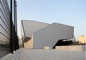 Deze link komt sterker naar voren in het andere paviljoen waarbij de grote glazen gevel gericht is op de straat. Dit paviljoen wordt gedeeld door de andere voetbalvereniging en de jeugdvereniging. De kantine van de voetbalvereniging steekt ook weer door richting de speelvelden. Op de begane grond delen de drie gebruikers de ruimte. De vormgeving van de twee paviljoens konden ondanks het verschil in gebruik toch nagenoeg gelijk blijven. De kleine verschillen en de verdraaiing van de paviljoens vormt een prettig samenspel.