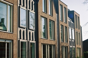In lijn met de nieuwe betekenissen die zo ontstaan worden traditionele materialen op een afwijkende wijze gebruikt. Het ambachtelijke zinkwerk van de geknikte gevel maakt het mogelijk geen goot toe te passen, maar het regenwater over de gevel tot op de straat te laten lopen. De gemetselde kopgevels uit een roodbruine baksteen in het kleine IJsselformaat zijn gemetseld in afwisselt liggend, staand en blokverband. Zo wordt stijl toegevoegd door het vlak te verdelen in respectievelijk liggers, staanders en knooppunten.