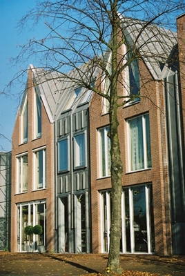 Kenmerkende fragmenten en typologieën worden uit hun context gehaald opnieuw geïnterpreteerd. De kap die traditioneel zorgt voor massa reductie in de hoogte wordt hier samengevoegd met de gevel waardoor geen kap maar een geknikte gevel ontstaat. De van oudsher gemetselde gevel met raamopeningen wordt hier teruggebracht tot schijf en gaat een spel aan met de zinken massa. br>Materialen