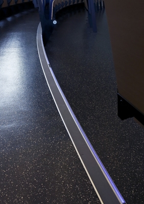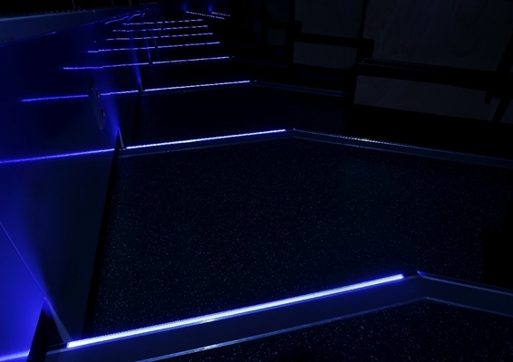 Trapneuzen met LED verlichting worden vaak toegepast in o.a. bisocopen, theaters, discotheken en collegezalen, mede door de strengere eisen in Bouwbesluit 2012. Er is gekozen voor een doorlopende verlichting van blauwe LED's wat het geheel een zachte uitstraling geeft, die niet afleidt tijdens colleges. Storax levert een oplossing op maat voor ieder project. Zoals u op de foto's ziet, kan Storax een trapneus in elke gewenste lengte en radius fabriceren.