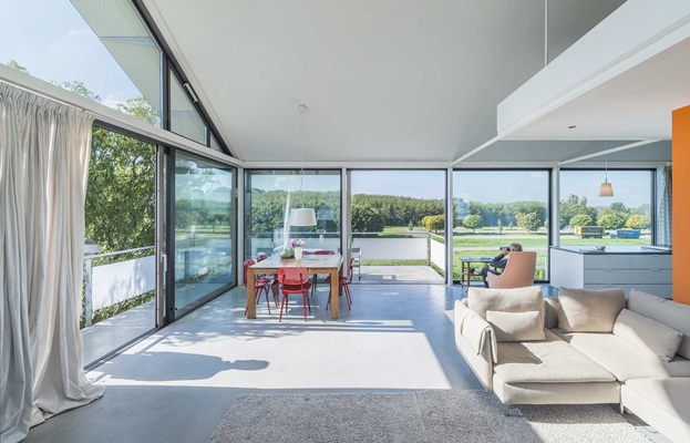 Het ruimtelijk concept van de woning is een open plattegrond met doorgaande verbindingen. Op de entreeverdieping zijn een berging en een kleedruimte in het hrt van de woning gesitueerd. Hieromheen zijn alle ruimten in een doorgaande lijn gerangschikt. Elke ruimte geeft een ander zicht op de omgeving. Zowel vanuit het bad als in de douche is het mogelijk om over het landschap uit te kijken.