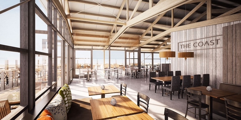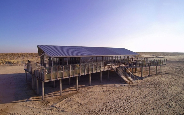 Om de vloeiende overgangen te benadrukken worden de constructieve lijnen van het hoofdvolume doorgezet in de doorgaande routing en het terrasdek. Hierdoor ontstaat er een dynamische vorm waarbij de grenzen tussen binnen en buiten vervagen. Aan de duinzijde gaan de constructieve lijnen over in de balustrades van de steiger. Boven het terras aan de zeezijde worden constructie lijnen ook doorgezet. In ruimte hiertussen zijn rolschermen te spannen voor bescherming tegen zon en regen. Het ‘’dichte’’ dak gaat geleidelijk over in een open lattenstructuur om de zachte overgang te benadrukken, ongeacht de stand van de translucente rolschermen. De constructie blijft deels zichtbaar, wat de tijdelijkheid van de constant veranderende natuur benadrukt.