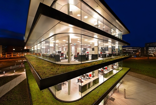 We ontwierpen een compact gestapeld paviljoen met horizontale belijning volledig van glas met afgeronde hoeken. Slanke, zwevende kantoorvloeren lopen door naar buiten waar ze overlopen in een groendak met mos-sedum begroeiing. De visuele grens tussen binnen en buiten wordt op deze manier minimaal. Werknemers staan zo op iedere verdieping direct in contact met de groene omgeving.