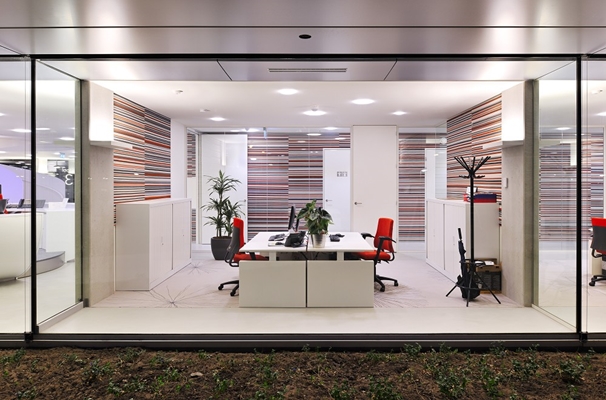 Het interieurontwerp van Ex Interiors zet het open karakter van het gebouw door om de ruimtelijkheid en transparantie zo veel mogelijk te benadrukken. Lichte kleuren en compacte, lage meubels zorgen ervoor dat het zicht niet geblokkeerd wordt. Ex Interiors ontwierp speciaal voor dit project geluidsabsorberende wandbekleding. De stroken gekleurd vilt bestaan uit gerecycled textiel uit de auto-industrie en oude tapijten dat is samengeperst en vervilt.