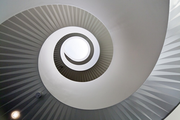 Bij binnenkomst valt direct de witstalen sculpturale trap op, een beeldbepalende blikvanger in de open en lichte ruimte die naast entree ook dienst doet als bedrijfsrestaurant, presentatieruimte en vergaderplek.