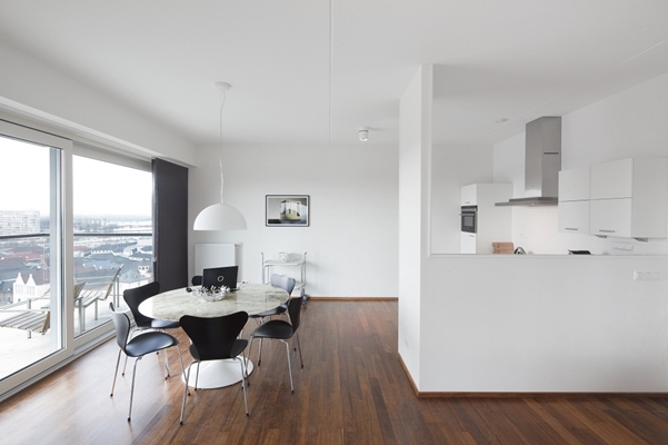 Tegenover de bouwplek staat een hoog kantoorgebouw. In ons bebouwingsplan hebben wij een hoge woontoren geïntegreerd als antwoord hierop. De toren is geleed in vier kwarten door afwisselend zwart metselwerk gevels te combineren met gepatineerde zinken gevels. Het maakt de toren slank en elegant.