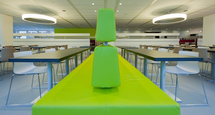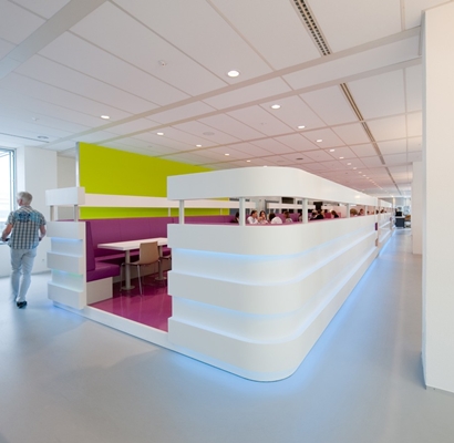 De belangrijkste ingreep in het restaurant bestaat uit de introductie van een langgerekt zitmeubel met een verhoogde vloer, bekleed met witte corian. Dit meubel verdeelt de grote, maar lage ruimte in meerdere gebieden; een zitgedeelte met grote kleurige banken, de zitplekken in het meubel zelf, de afruimband en het uitgiftegebied nabij de oorspronkelijke keuken. Kleuraccenten voortkomend uit de huisstijl van Robeco komen terug in de bekleding van de verschillende zitbanken en de vlakken op de wanden. In het uitgiftegebied is gekozen voor een wengé fineer voor de omkleding van de verschillende eilanden in combinatie met een corian bovenblad. Deze materiaalsoorten komen terug in de diverse tafelbladen en andere meubelen, waardoor het hele restaurant één sfeer ademt die past bij de nieuwe uitstraling van Robeco.