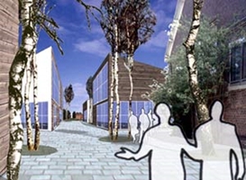 Een kleinschalige enclave van studio’s, ateliers, kantoren en werkplaatsen die als het ware een dorpje van 8 volumes vormen rondom drie historische monumenten. De aanwezige ondergrondse infrastructuur van kabels en (gas)leidingen is nog in gebruik en vormt een patroon van niet te bebouwen zones over het terrein. Donker gebeitste houten gevels, aluminium daken en metalen kozijnen vormen de huid van deze gebouwen. Gebakken klinkers bedekken het te belopen landschap tussen de gebouwen. De beplantingen behoren tot het nieuw ontworpen park.
