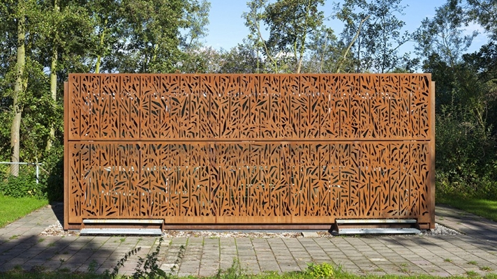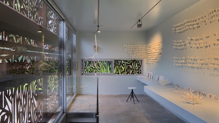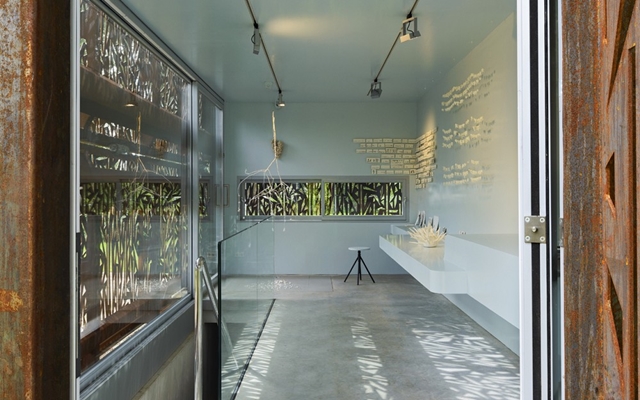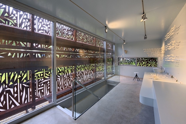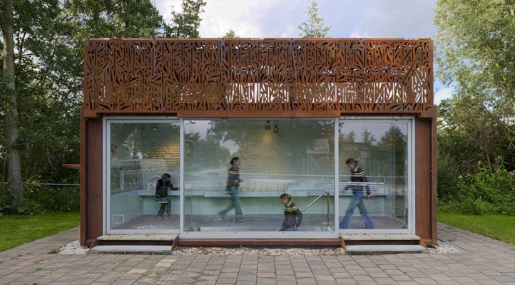 Midden in het plassengebied tussen Loosdrecht en Kortenhoef is een smoezelige snackbar vervangen voor een atelier annex galerie. Het cortenstalen gebouwtje is geplaatst op een betonnen kelder. Beide onderdelen zijn volledig geprefabriceerd, met diepladers vervoerd en vervolgens ter plekke samengevoegd. De zuidgevel is voorzien van een groot geperforeerd luik (lengte 7,5 meter). Behalve dat het luik toont wanneer de galerie open ofwel gesloten is, kan het als zonwering gebruikt worden. In gesloten toestand werkt het luik ook als een vitrage waardoor in rust gewerkt kan worden. De perforaties zorgen voor een mooi gefilterd licht. Het patroon refereert aan de rietkragen langs de omliggende plassen. Het cortenstaal is zowel opvallend als ingetogen in dit mooie landschap. Door het royale trapgat bereikt voldoende daglicht de werkruimte in de kelder. In de kelder is behalve een groot werkblad ruimte voor de ovens, opslag en sanitair. De begane grond kon zodoende leeg en licht blijven. Over de volle lengte aan de achtergevel is een laag meubel gemaakt dat gebruikt wordt om te werken en/of te exposeren. Bij mooi weer staan de beide schuifdeuren open en is de expositieruimte direct gekoppeld aan het terras.