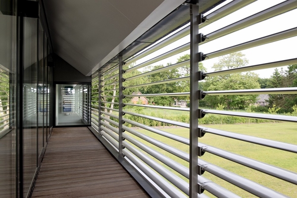 Aan de straatkant ziet de woning er van buiten ingetogen uit, maar aan de achterkant is het buitenleven geïntegreerd in de woning en is de gevel nagenoeg geheel van glas. Om overmatige instraling van zonlicht te voorkomen is de gevel op de verdieping aan de zuidzijde geheel voorzien van lamellen. Hierdoor behoud de woning zijn ingetogen karakter en ook zijn “schuurachtige” gesloten vorm . Aan de noordelijke straatzijde is over de volledige lengte een doorlopende lange gang gesitueerd. Op de begane grond vormt deze gang een buffer tussen de diverse woonfuncties en het voorterrein aan de straat. Omdat de gang door middel van een vide in verbinding staat met de verdieping, beleef je deze ruimte integraal als een straat of looproute door de woning, van waaruit alle “woonfuncties” bereikbaar zijn.