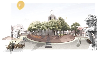 Monumentale bomen, bestaande gemetselde muurtjes, het historische stadhuis en het Geuzenmonument bepalen de sfeer van het plein. Op een respectvolle en moderne manier hebben we het plein herontworpen zonder hierbij de historische betekenis van de plek uit het oog te verliezen. Zo worden alle elementen op het plein geplaatst in een traditioneel en neutraal tapijt van rode bakstenen wat de aandacht van de bezoeker richt op wat het plein historisch interessant maakt. Een sterk driedimensionaal element, wat wordt gevormd door de bestaande bomen, is reeds aanwezig. Door in het nieuwe plan de elliptisch vorm waarin de bomen geplaatst zijn te benadrukken, middels een tapijt van speciaal ontworpen cortenstalen boomroosters en een gazon, wordt ook in het platte vlak de nadruk op deze belangrijke structuur gelegd. Naast een visuele verbetering dragen beide onderdelen ook bij aan de groeiplaatsverbetering van de bomen. De elliptische vorm zal op enkele plaatsen onderbroken worden om looproutes en het Geuzenmonument een plaats te bieden. Om conflicten te voorkomen staat het monument als een autonoom object in de ruimte, ongehinderd door andere ontwerpelementen. Een ring van Zweeds graniet herhaalt de vorm van de ellips en accentueert de overgang van het open plein naar de omliggende gebouwen. Tegelijkertijd geeft deze zone de aanwezige restaurants de mogelijkheid om hun terrassen veilig en gestructureerd te positioneren. Het minimalistische, moderne en complete ontwerp zal de markt transformeren in een verblijfsruimte van hoge kwaliteit welke zal bijdragen aan het respect voor de historie van de plek zonder historiserend te zijn: moderne historie.De ruimte zal mensen uitnodigen uit te rusten in de schaduw van de monumentale bomen, te genieten van een verfrissend drankje op een terras en het zal ruimte bieden aan diverse activiteiten waaronder de markt.