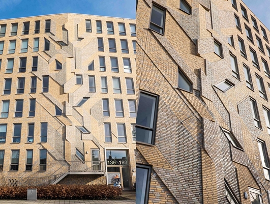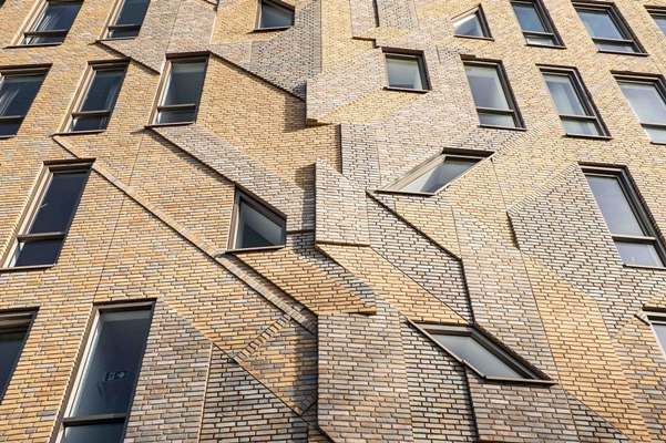 Met een mix van stoere kaders in de gevels en een palet van geel, grijs en blauwgroen geëngobeerde baksteen, worden zowel de panden als het gebouw versterkt De omliggende wederopbouwkunst inspireerde tot samenwerking met beeldend kunstenaar