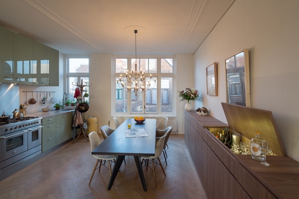 De bovenwoning strekt zich uit over drie verdiepingen. De plattegronden zijn hier zo open mogelijk gehouden, waardoor daglicht van twee kanten tot diep in de woning kan doordringen. De badkamer op de tweede verdieping is ontworpen als een vrijstaand meubel dat de twee slaapkamers van elkaar scheidt. Het al bestaande dakterras op de vierde verdieping is volledig vernieuwd en uitgevoerd in staal. De sterkere constructie maakt het mogelijk het terras af te werken met betontegels, waarop nu een grote hoeveelheid kuipplanten geplaatst kan worden.