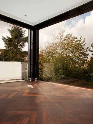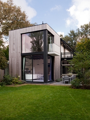 De plaats van de keuken was louter een invulling en de masterbedroom op de verdieping een vanzelfsprekendheid. Het gedeeltelijke hergebruik van het huidige volume van de uitbreiding was voor ons een uitdaging. Het bestaande gemetselde casco leende zich prima voor de beoogde metamorfose. Om de tuin op beide verdiepingen bijna letterlijk binnen te halen is de gehele hoek weggebroken en een stalen constructie ingebracht. De aluminium frameloze schuifpuien van meer dan 3 meter hoog scheiden binnen van buiten. De houten gevelbekleding vormt een schil om het bestaande metselwerk heen en maskeert de schuifpuien met elektrische zonwering in geopende stand.