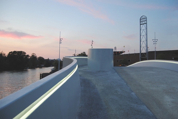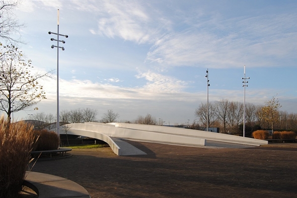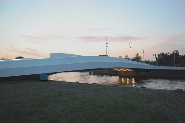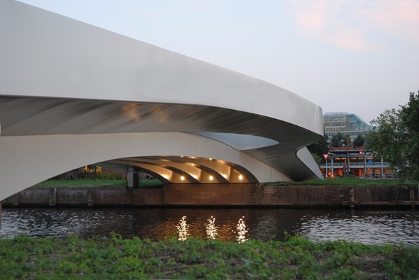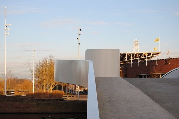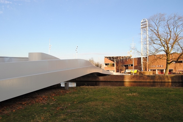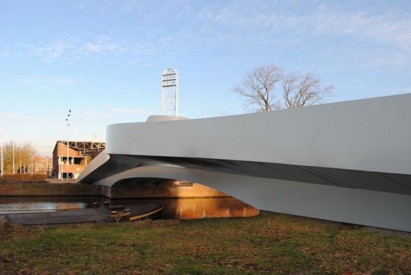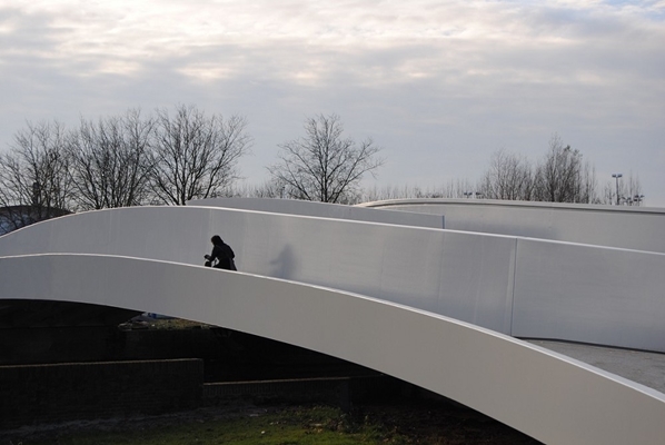 Vanaf de zijkant zijn de afzonderlijke lijnen met elk hun eigen geometrische eigenschappen visueel samengebracht tot één geheel, waardoor ze de eigen identiteit van de brug versterken.