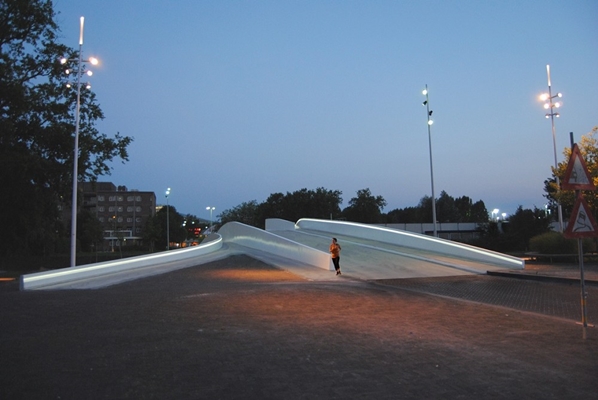 Door een omloop wordt de voetganger gedwongen om zijn focus te verleggen van de brug naar de omgeving. Tevens wordt op deze plaats de relatie van de brug met het water versterkt door een gat in het brugdek en wordt de voetganger geconfronteerd met een geheel ander beeld van de brug dan men van de zijkant zou vermoeden.