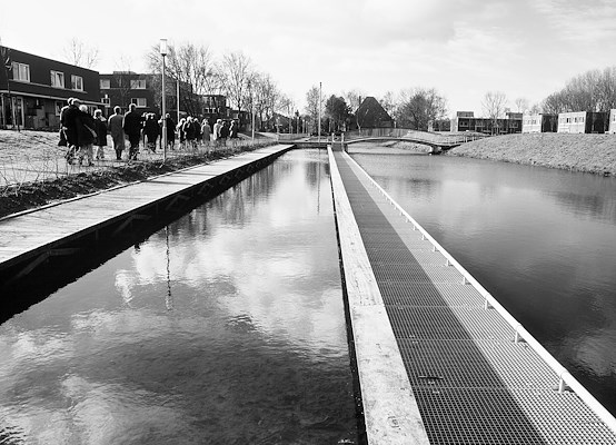 De parkstrook op de overgang van hoog naar laag is het hart van de nieuwe wijk. De rechthoekige waterpartij heeft een strakke omlijsting als van een schilderij, waarbinnen een ovale grassculptuur in de vorm van een schiereiland is gevat. Een doorgaande route voor langzaam verkeer doorsnijdt het water en het schiereiland. Aan de voet van het schiereiland vormen ondieptes in het water, zogenaamde ‘paddenpoefs’, speciale condities voor kikkers en amfibieën.