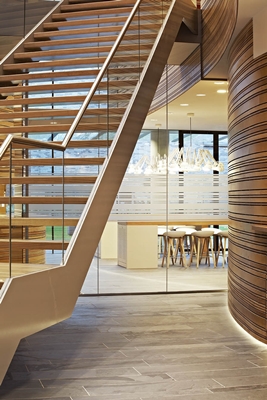 In het hart van het hotel is door de openingen in het dak de lucht zichtbaar. Bij binnenkomst zorgt de binnenwereld voor een bijzondere ruimtelijke ervaring. Deze staat symbool voor een warm welkom bij het hotel. De receptie, een ellipsvormig volume, loopt door als bar, hieromheen liggen de lounge, de ontbijtruimte en het restaurant (ontwerp M+R interior architecture), met een terras op de zuidzijde.